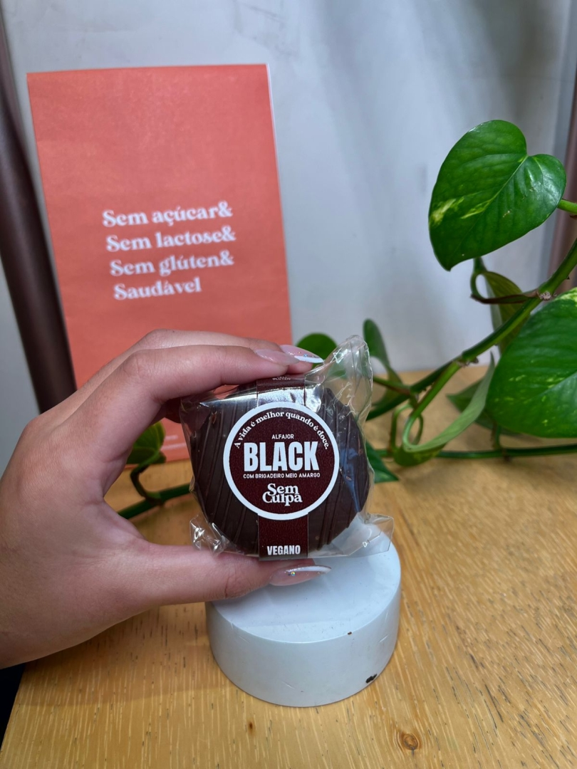 Biscoito de cacau Black recheado com nosso brigadeiro funcional de chocolate meio amargo e coberto com chocolate preto 51% (adoçado com eritritol e stevia). Sem lácteos, sem glúten, vegano, adoçado com eritritol e açúcar de coco. Não tem como não amar esse sabor!